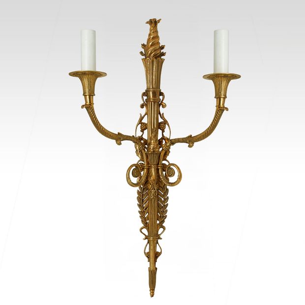 Современная разработка, навеянная образцами стиля ампир. Не только форма рожков, но и основание, на котором они закреплены, напоминают факел. Без излишеств в украшении – лавровая ветвь, которую торжественно вручали победителю. Строгое бра на четыре светильника.
