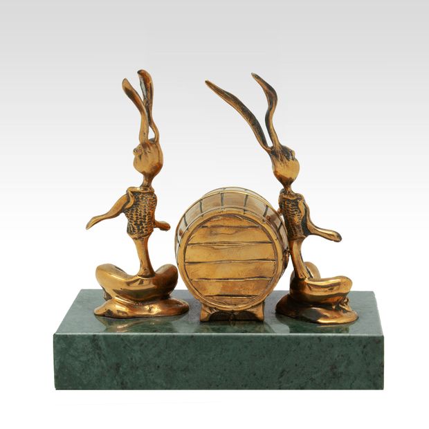На прямоугольном каменном постаменте два кролика. Они уже опрокинули бочонок и опять что-то задумали. Эти непоседы не могут усидеть на месте.