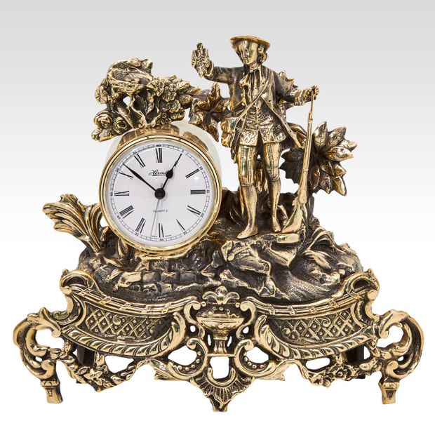 Часы подобной композиции, с изображением охотников или сцен охоты, были довольно популярны, существует множество авторских вариантов этого сюжета.