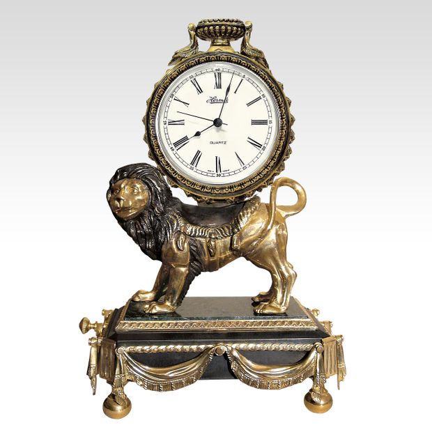 Современная авторская разработка в неоклассическом стиле эпохи Людовика XVI. В то время широкое распространение получили часы в виде животных: льва, слона, быка, носорога, лошади с часовым механизмом на спине.