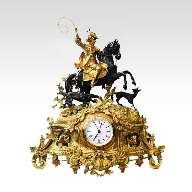 Сцена охоты – распространенный еще со времен Средневековья мотив в искусстве. Корпус часов украшен скульптурой всадника в костюме французского вельможи XVII века. Впереди лошади изображена бегущая лань, преследуемая собакой. Цоколь сложной формы с волютами по сторонам, украшен охотничьими трофеями и дубовыми гирляндами.