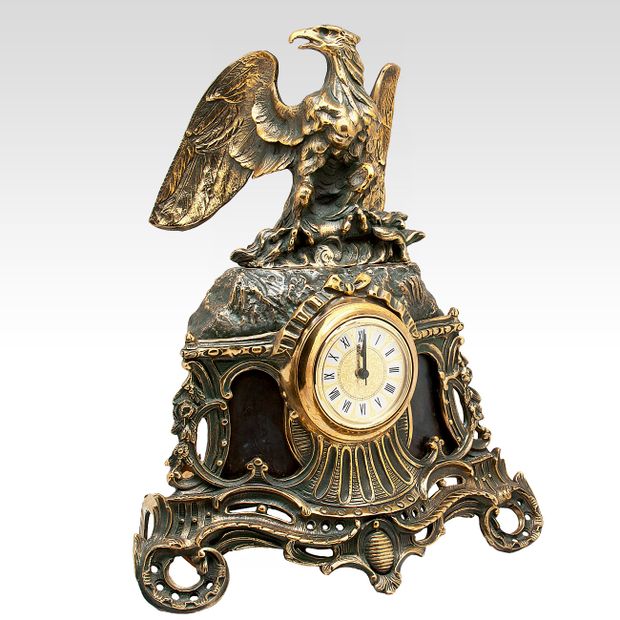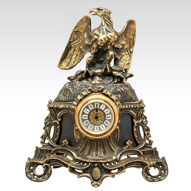 Рекомендую каминные часы со скульптурой пернатого хищника орла, украшающего монументальный корпус. Это интерьерный аксессуар, который подчеркивает должностной статус в классическом стиле. Часы словно поют гимн орлу, символу силы, власти, господства, внутренней мощи, прозорливости правителей.