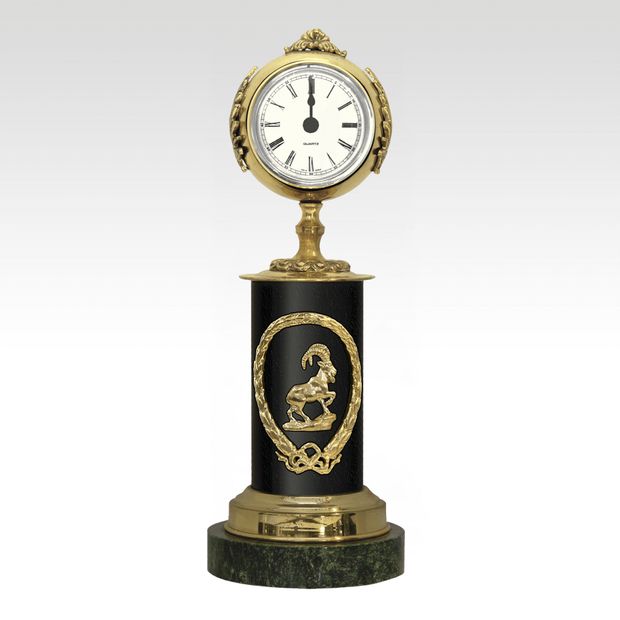 Часы «Подарочные» интересны формой корпуса, увенчанного пальметтой, расположенного на подставке в виде черного цилиндра, обрамленного шлифованной бронзой. В оформлении используется поделочный камень и накладки с разнообразной тематикой. Строгость и изысканность цветовой гаммы, современный дизайн в сочетании с благородным блеском бронзы или латуни, делает их неповторимым подарком.