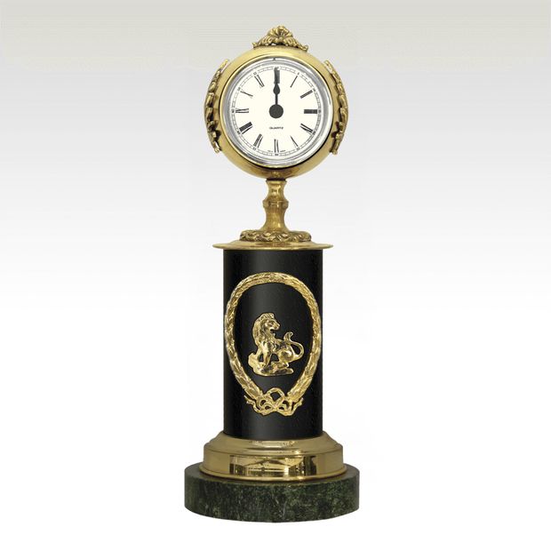 Часы «Подарочные» интересны формой корпуса, увенчанного пальметтой, расположенного на подставке в виде черного цилиндра, обрамленного шлифованной бронзой. В оформлении используется поделочный камень и накладки с разнообразной тематикой. Строгость и изысканность цветовой гаммы, современный дизайн в сочетании с благородным блеском бронзы или латуни, делает их неповторимым подарком.