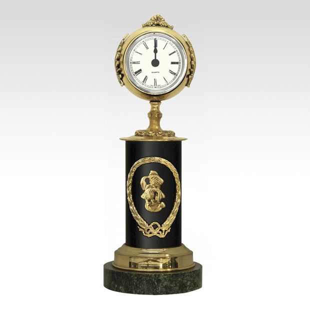 Часы «Подарочные» интересны формой корпуса, увенчанного пальметтой, расположенного на подставке в виде черного цилиндра, обрамленного шлифованной бронзой. В оформлении используется поделочный камень и накладки с разнообразной тематикой. Строгость и изысканность цветовой гаммы, современный дизайн в сочетании с благородным блеском бронзы или латуни, делает их неповторимым подарком.