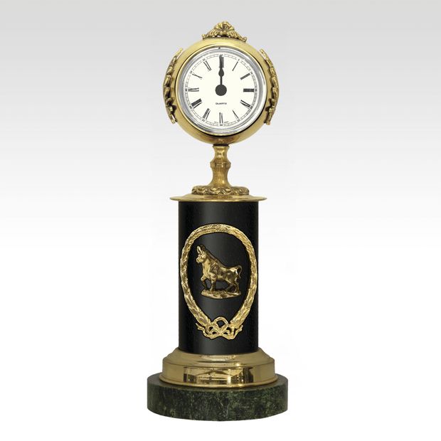Часы «Подарочные» интересны формой корпуса, увенчанного пальметтой, расположенного на подставке в виде черного цилиндра, обрамленного шлифованной бронзой. В оформлении используется поделочный камень и накладки с разнообразной тематикой. Строгость и изысканность цветовой гаммы, современный дизайн в сочетании с благородным блеском бронзы или латуни, делает их неповторимым подарком.