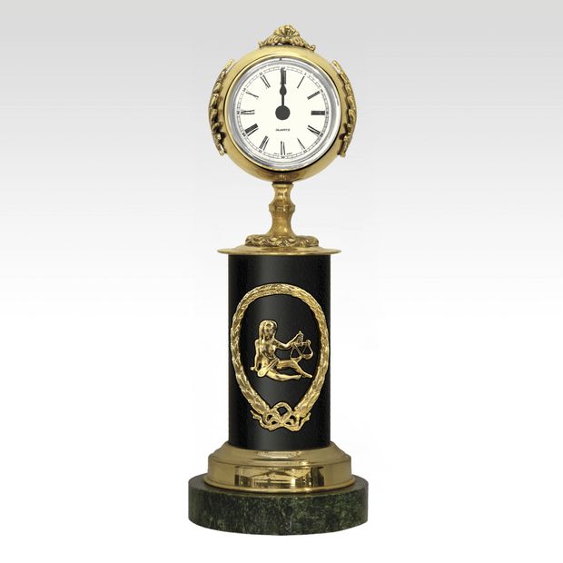 Часы «Подарочные» интересны формой корпуса, увенчанного пальметтой, расположенного на подставке в виде черного цилиндра, обрамленного шлифованной бронзой. В оформлении используется поделочный камень и накладки с разнообразной тематикой. Строгость и изысканность цветовой гаммы, современный дизайн в сочетании с благородным блеском бронзы или латуни, делает их неповторимым подарком.