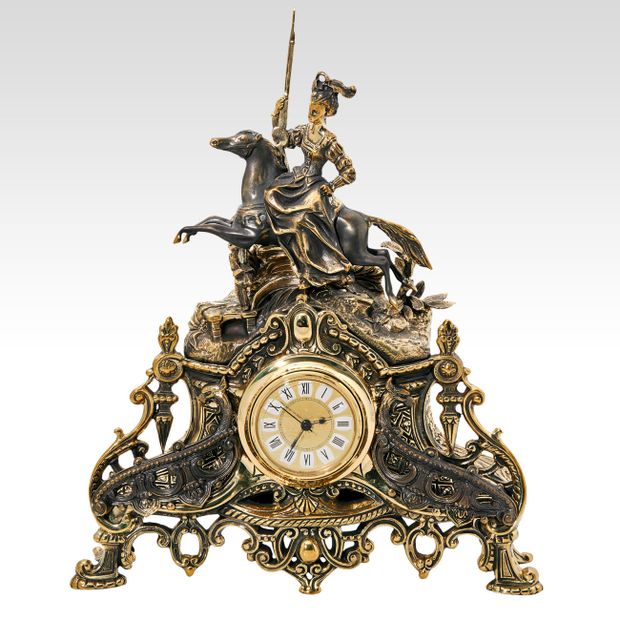 Корпус часов сложносоставной, состоящий из завитков рокайлей и картушей, увенчан скульптурой всадницы – молодой девушки в костюме XVIII века с ружьем в правой руке.