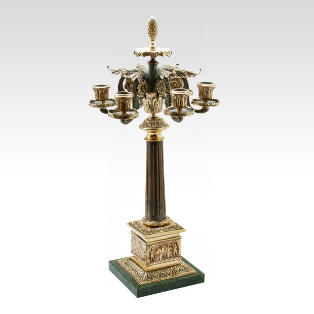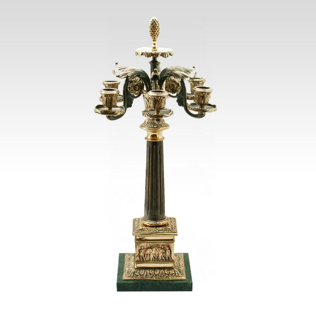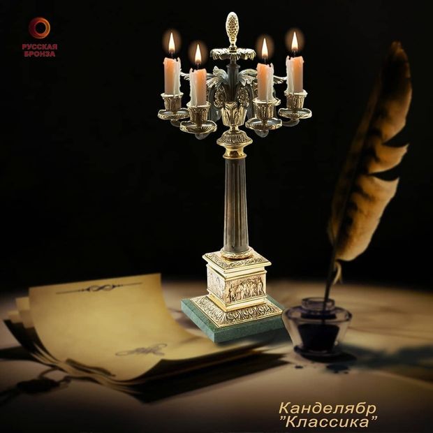 Канделябр выполнен в лучших традициях старинного декоративно-прикладного искусства из золотистой бронзы. Создан по оригинальному эскизу методом художественного литья. Художники детально проработали каждый декоративный элемент, что позволило придать изделию особый лоск и выразительность.
