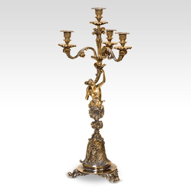 Изысканный постамент, украшенный причудливым декором, венчает фигура античной богини. Она держит рог изобилия, из которого, будто диковинные цветы, вырастают свечники.