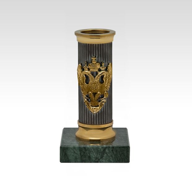 Современная авторская разработка - карандашница, декорированная российской символикой. Бронза - изысканный металл для интерьера любого рабочего кабинета. Подставка из натурального камня змеевика делает изделие более увесистым.