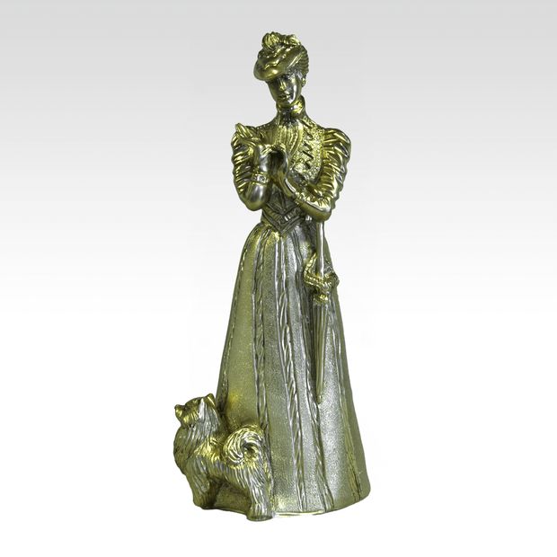 Листая страницы сайта «Русская Бронза», наткнулась на колокольчик «На прогулку». Дама натягивает перчатку, собирается, видимо, пройтись по улице, вывести на свежий воздух домашнего питомца. Мой любимый тип колокольчиков – с сюжетом. Мне видится, что прогулка эта – ритуал каждодневный и привычный, тем не менее, важный. Как спокойно собачка ждет свою хозяйку, женщина не спеша натягивает перчатку, как она тщательно одета. Не просто идет гулять, а себя показать. Чувствуется, что дама со статусом.