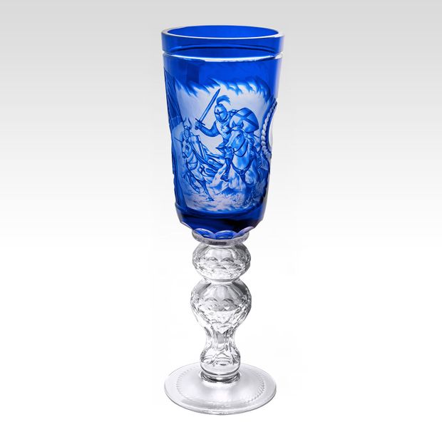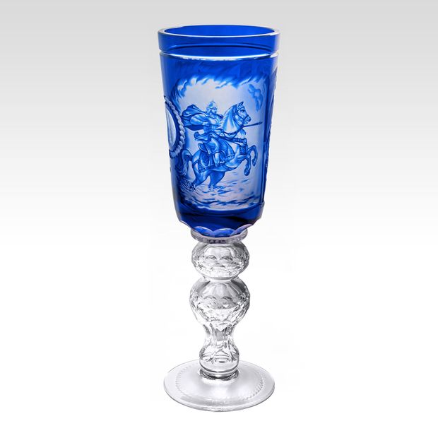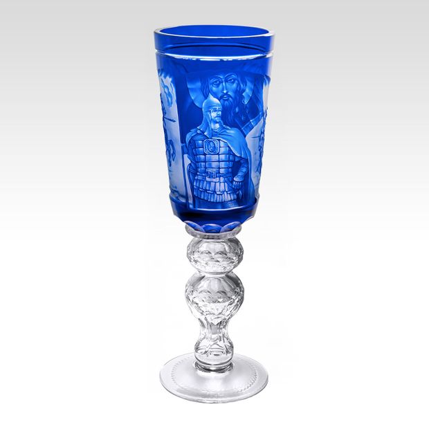 Композиционным центром кубка является уникальное изображение Александра Невского, при изготовлении которого используется ручная гравировка с применением техники "оптическая линза". Это изображение прекрасно просматривается через оптическую линзу, которая расположена на оборотной стороне кубка, что вызывает необычайно эффектное и незабываемое впечатление. Ручная гравировка и алмазная грань придают объемность и панорамность изделию, подчеркивая красоту и пластичность хрусталя, а кобальтовый цвет, став синонимом королевской роскоши, только усиливает эти свойства.