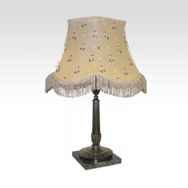 Довольна приобретением! Кабинетная лампа выполнена из бронзы с покрытием патина. Хорошо освещает поверхность стола и собеседников. В стороны свет проникает слабо, т.к. стенки текстильного ретро-абажура мало пропускают свет. Выключатель на проводе. Провод длинной примерно 1 метр. На мой взгляд, лампа отлично вписалась в интерьер.
