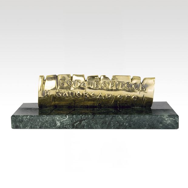 На камне из змеевика помещена береста с цитатой из Ветхого завета, "Книга Екклесиаста 12:13. Выслушаем сущность всего: бойся Бога и заповеди Его соблюдай, потому что в этом все для человека"