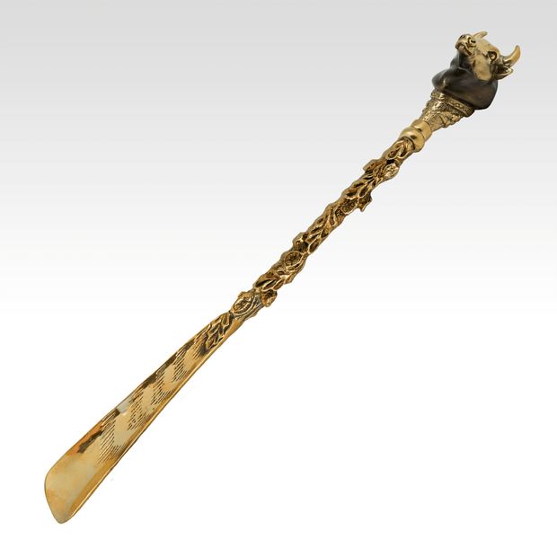 Мы предлагаем Вам ложку для обуви - необходимый аксессуар в каждом доме. Ручка выполнена в виде быка, который является ключевой фигурой финансового благополучия. Не зря "быками" на биржевом сленге называют трейдеров. Значит в Вашем доме всегда будет бык, излучающий позитивную силу и отбивающий любую атаку!