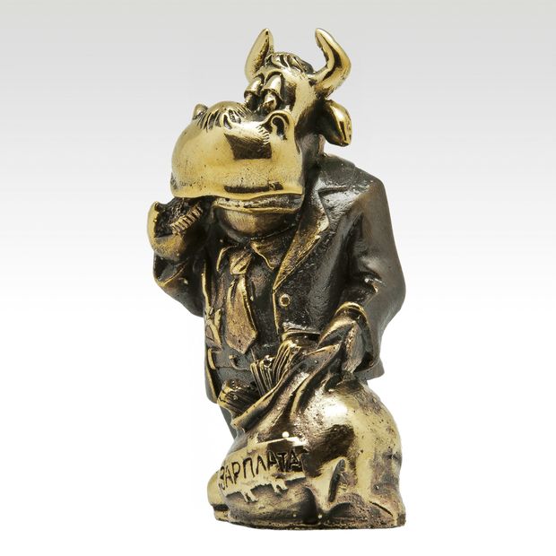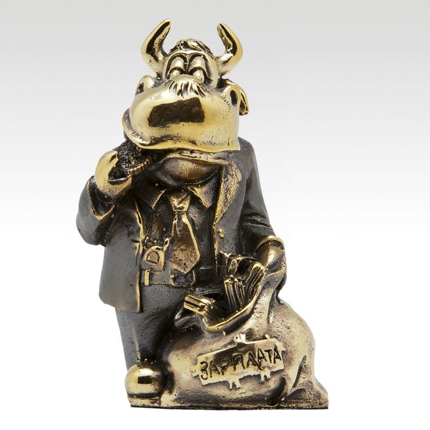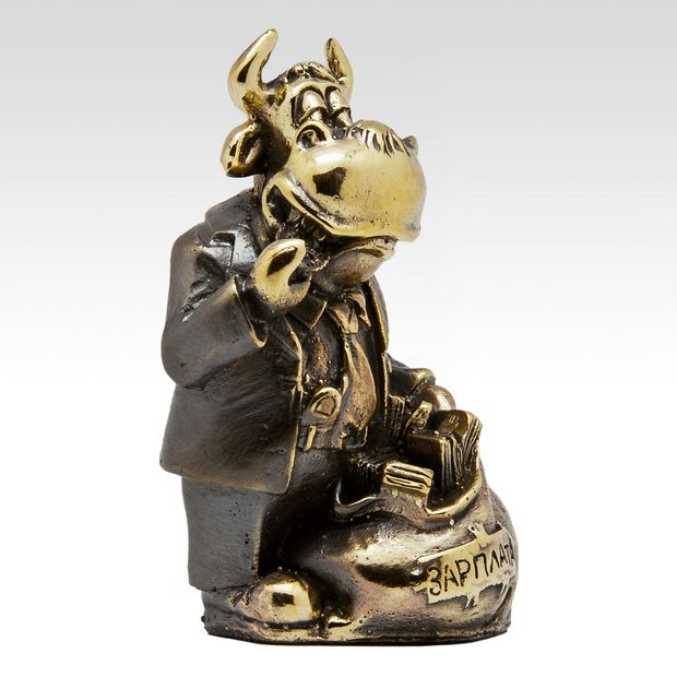Наш "железный" (бронзовый) трудоголик - бычок "счастливчик" спешит порадовать и одарить каждого приятным зарплатным мешком - мешком пожеланий финансовой стабильности и благополучия!