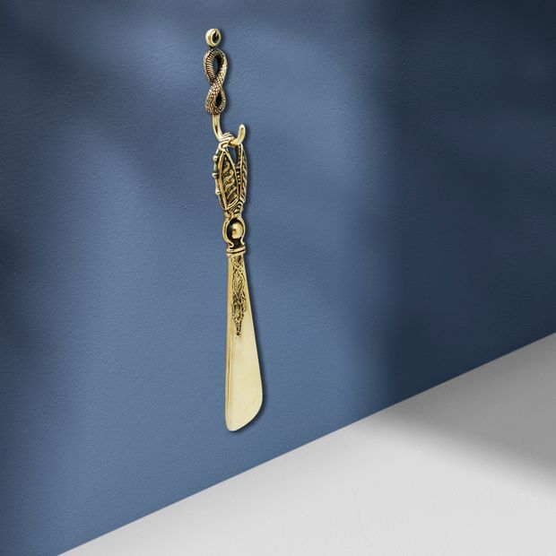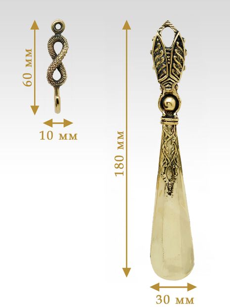 Но и дома ложка для обуви станет незаменимым помощником, и чтобы её не терять мы рекомендуем обустроить для ложки уютное местечко в прихожей. Небольшая петля на верхнем конце ручки позволяет гармонично повесить её на специальный бронзовый крючок под названием «Бесконечность», выполненный в виде одного из самых популярных и распространенных символов в науке и оккультном искусстве. Этот символ бесконечности прост, но таинственно прекрасен, он символизирует гармонию и вечность, позволяет человеку понять то, что другим недоступно. Данный символ обладает значительной силой и позволяет человеку самосовершенствоваться, достигать гармонии благодаря знаниям, соединять в себе духовное и материальное. Знак способен положительно влиять на любое помещение, в котором он будет находиться. Если повесить этот знак в прихожей комнате, можно гармонизировать пространство и приумножить положительную энергию. Высота крючка для обувной ложки 60 мм, ширина 10мм. Бронзовый крючок «Бесконечность» крепится к стене шурупом, который также входит в состав набора.