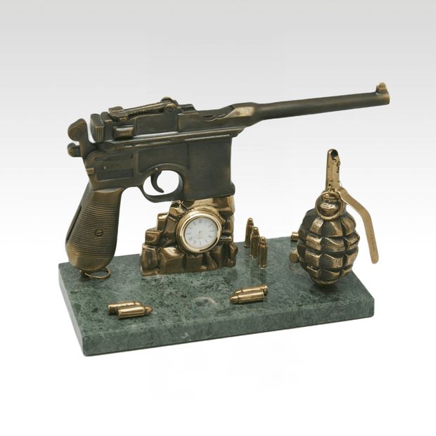 ПИСЬМЕННЫЙ ПРИБОР "МАУЗЕР" (С ЧАСАМИ) - является точной копией легендарного пистолета 1896 года. Производители "Русской Бронзы" сохранили подлинный вес и размер.