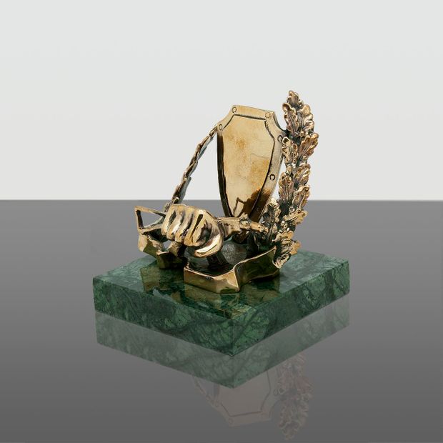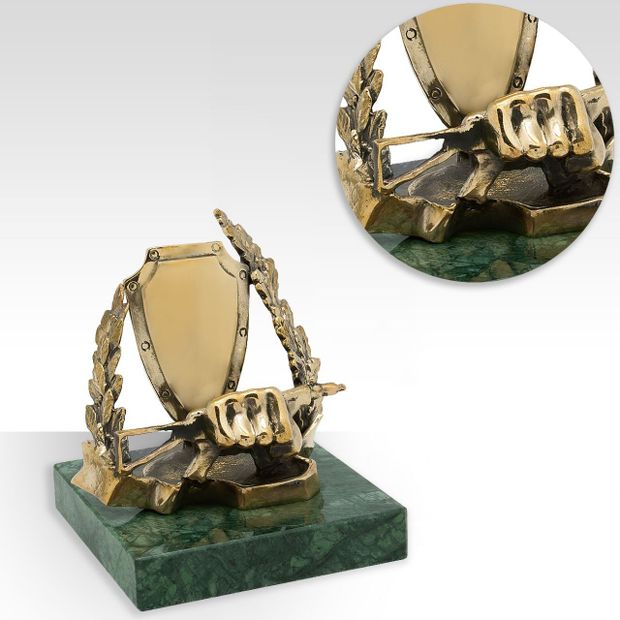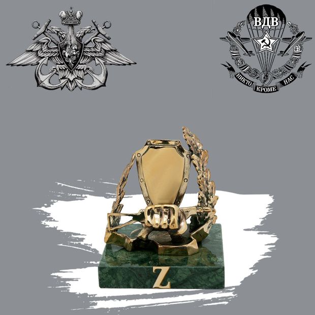 Традиционная символика Сил специального назначения – кулак (культ рукопашного боя) и автомат АКС-74УБ с ПБС-4 (символ огневой мощи подразделений спецназа, готовых выполнить любую поставленную задачу). В салоне на Малом Афанасьевском пер. 5/15 нашли то, что искали! Подставка под телефон "МУЖЕСТВО" на камне сделана в виде щита украшенная кулаком, сжимающая оружие, символизирующая силу и мощь специального подразделения. На щит нанесли теплые слова в адрес виновника торжества. Подарок имел успех!