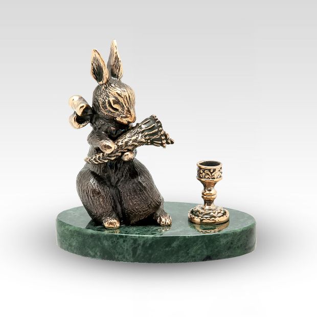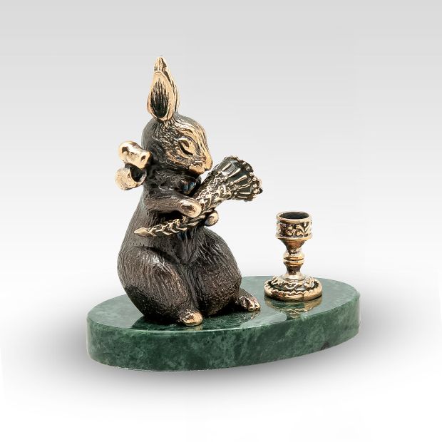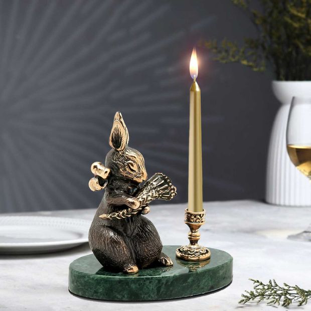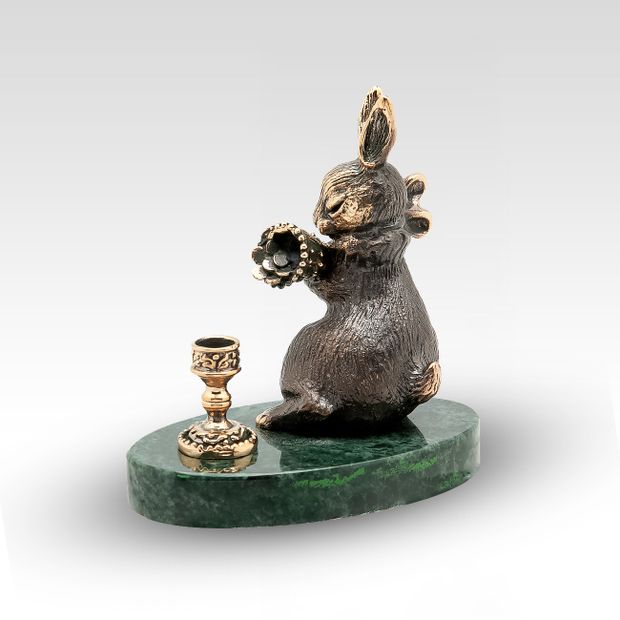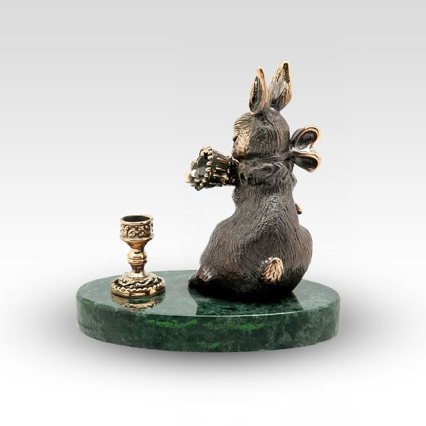 Подсвечник «Солнечный зайчонок» - миниатюрный авторский шедевр, наполненный особой аурой ручного труда. Сделан в виде зайчонка, в лапах которого расположился рог изобилия, исходящий корнями от древних греков, извергающий дары благосостояния и создающий целое море богатств. Фигурка кролика крепится на камне под названием змеевик, магическая сила которого оберегает от опасностей на жизненном пути, а также служит талисманом "деловых людей", юристов и спортсменов. Другими словами, подсвечник «Солнечный зайчонок» выглядит словно отдельная композиция для свечи, ведь любая свеча, как дорогой гость, заслуживает особого внимания.