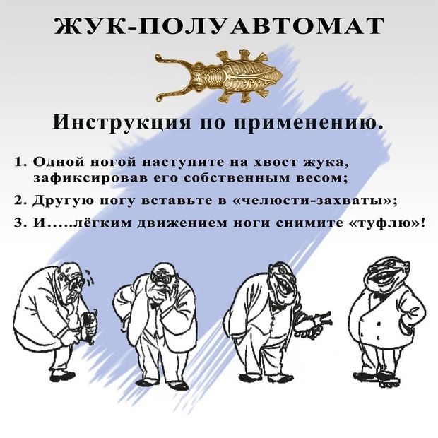 Конструкция обувного помощника в виде скарабея основана на изобретении, которое широко применялось на Руси в барских домах и было предназначено для снятия обуви без использования рук - только с помощью одной ноги. Как? Очень просто! Наступите жуку на спинку одной ногой, пятку второй ноги расположите под усиками жука и вытяните ногу из ботинка! Гениально!