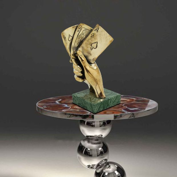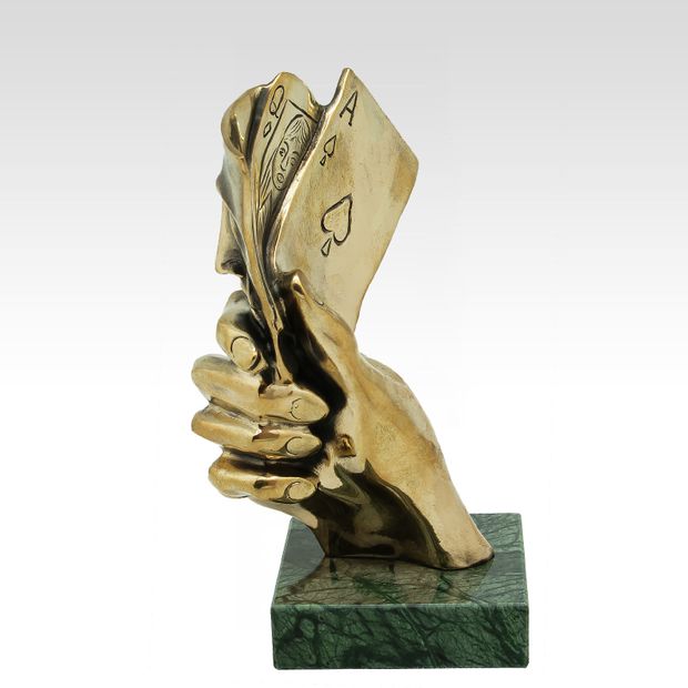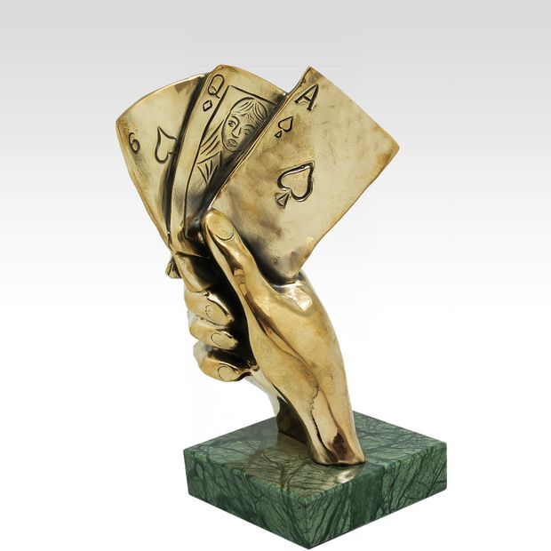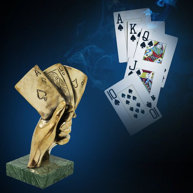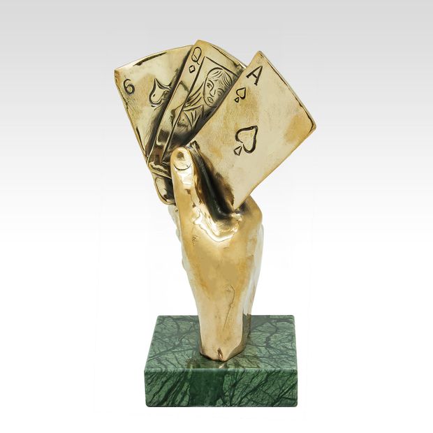 Несмотря на некоторое табу и осуждение обществом, многих людей привлекают азартные игры, и они, как мотыльки, летят к светящимся в ночи огням казино, чтобы в очередной раз испытать судьбу у пиковой дамы. Скульптура "Игра"отображает комбинацию "Каре" в руке удачливого игрока в покер. Взявшись за карты, можно объявить, например, о начале игры в покер решившим скоротать у Вас вечер игрокам. Надеемся, что именно Вам будет благоволить фортуна, осаждая очередную раздачу в покер или расписывая пульку в преферансе. Чего уж там! Скульптура "Игра " сможет оживить даже партию в подкидного дурака.
