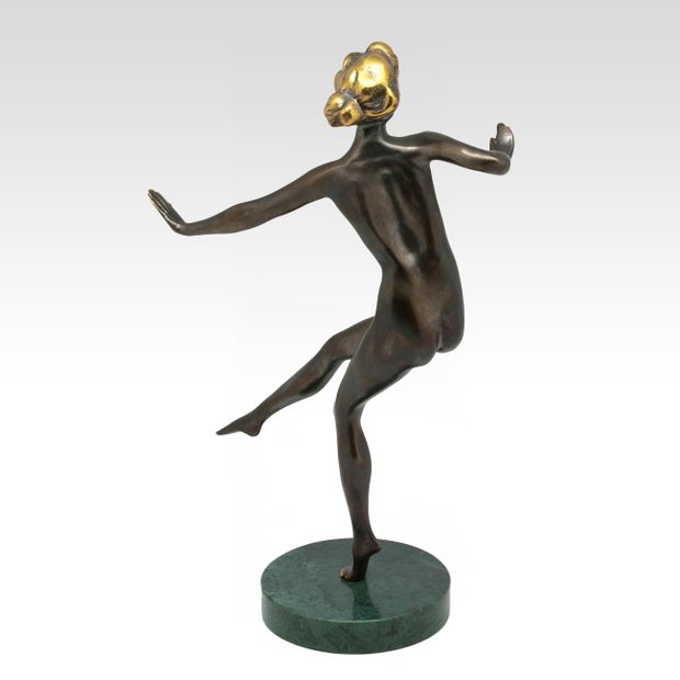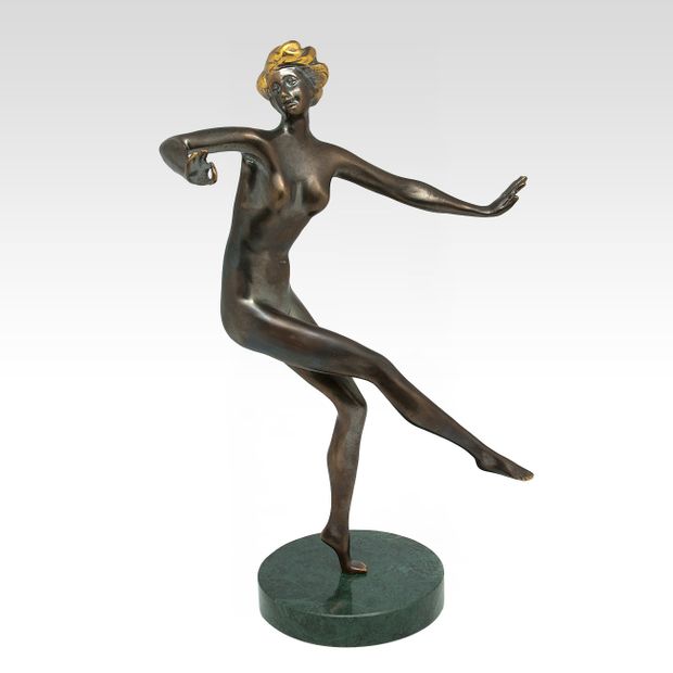 Модерн стиль исполнения статуэтки точно передает грацию, легкость и полную самоотдачу танцу. Возникает ощущение естественного объема, выразительности силуэта танцовщицы и особого тепла, которое излучает металл, словно наполненный жизнью.