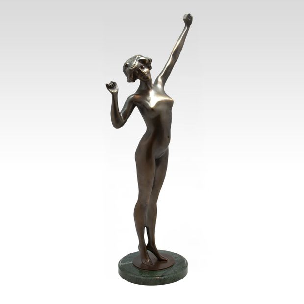 Чудесная камерная реплика в стилистике Ар Деко. Высоко привстав на носочки, молодая девушка представленной бронзовой скульптуры сладко потягивается после сна. Правую руку она широким инстинктивным движением отвела в сторону, левая, согнутая в локте рука заведена за голову, за копну пушистых волос. Юная прелестная фигура девушки вызывает у меня восхищение и желание любоваться. Мастерски схваченное автором непроизвольное движение точёных рук героини сообщает изображению необыкновенный динамизм и энергию. Класс!!!