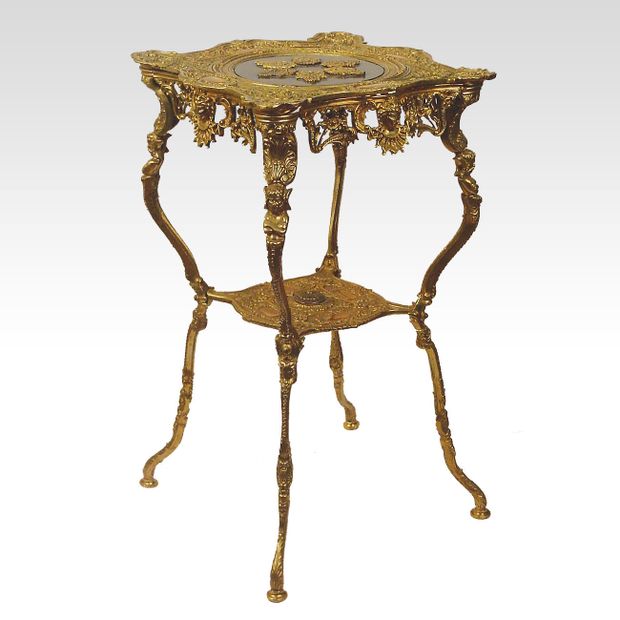 Бронзовый столик-этажерка, с ножками изогнутой формы, украшенными гротесковым орнаментом – четыре фигурки фантастических образов зверолюдей, на голове держащих пальметту. Ножки заканчиваются подушечками. Верхняя столешница украшена растительным орнаментом в сочетании с рокайлями (стилизованная раковина), по углам – ангелами; в центре на патинированной бронзе - ажурный орнамент в виде цветка, по краю – растительный, в сочетании с маскаронами, в виде женского лица. В нижней столешнице орнамент повторяется.