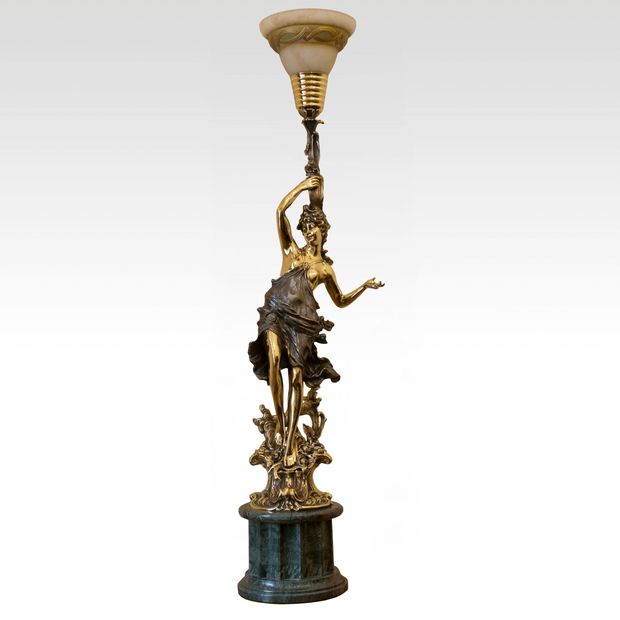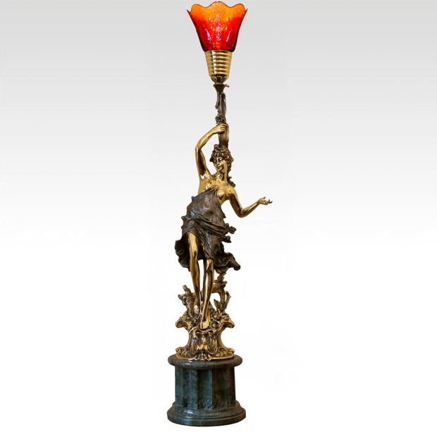 Пластика женской фигуры, струящиеся, «текущие» линии, мотив движения, «природные» формы и оригинальный абажур из цветного стекла…