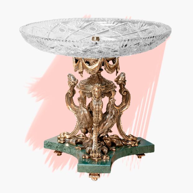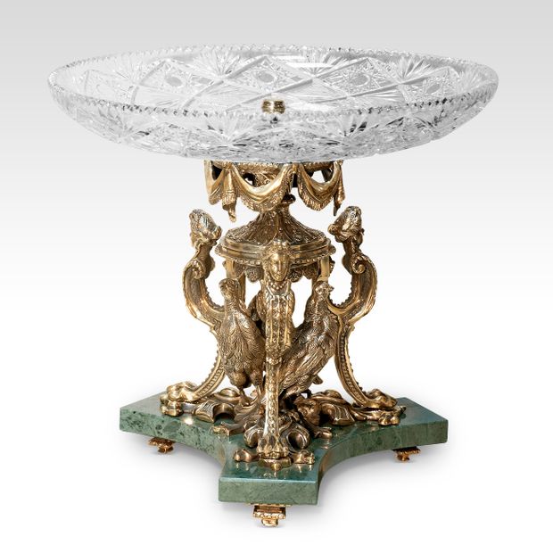 Хрустальное блюдо укреплено на бронзовом основании в виде трех декоративных мотивов, так называемых "эспаньолет"... Между ними изображены птицы – три кукушки.