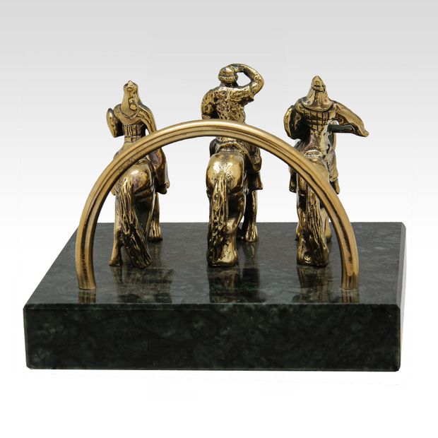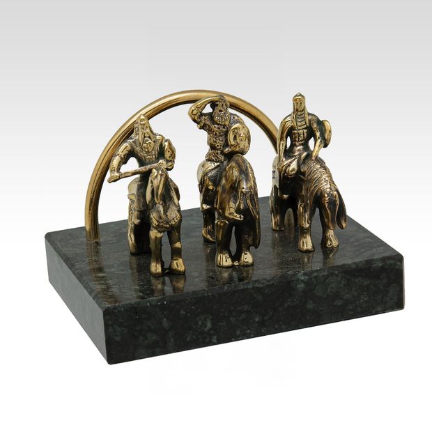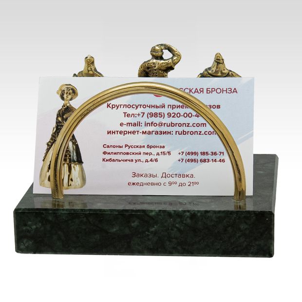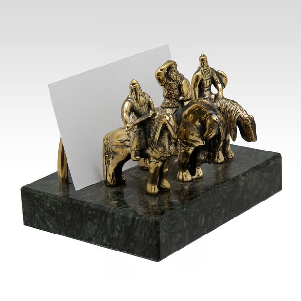 Визитница "Три богатыря" отображает сцену известной картины Васнецова. В композиции воспроизведены три совершенно разных образа, объединенных идеей служения родной земле. Илья Муромец всматривается вдаль, прижав руку ко лбу – он воплощает спокойную, неторопливую силу и мудрость. Добрыня Никитич держит наготове меч, олицетворяя энергию, доблесть и готовность в любой момент отразить нападение. Алеша Попович в одной руке держит лук, в другой – музыкальный инструмент. Его характеризуют творческий потенциал, тонкий ум и сметливость. Вместе эти трое героев – воплощение созидательной силы, творческих способностей и мудрости русского народа, идеи преемственности традиций и верности своей Родине. Они стали символом русской земли, ее могущества и непобедимой силы духа.